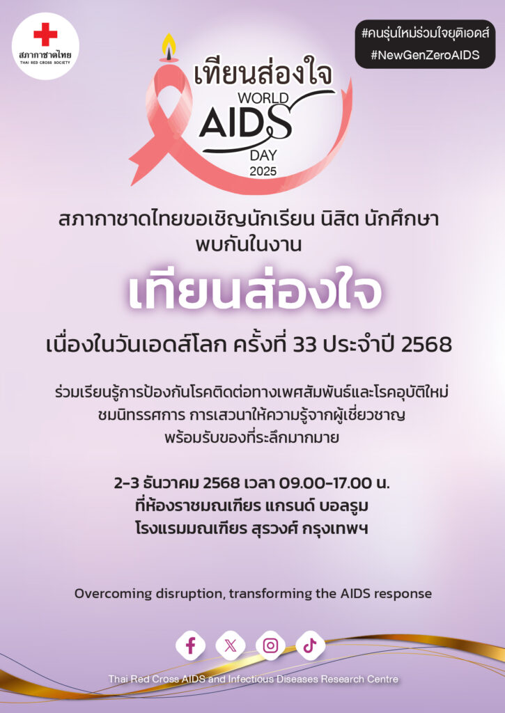สภากาชาดไทย นำโดย ศูนย์วิจัยโรคเอดส์และโรคติดเชื้อ ร่วมกับภาคีเครือข่าย ขอเชิญเยาวชน นักเรียน นิสิต นักศึกษา ที่มีอายุไม่เกิน 30 ปี เข้าร่วมงานเทียนส่องใจ เนื่องในวันเอดส์โลก ครั้งที่ 33 ประจำปี 2568 ระหว่างวันที่ 2-3 ธันวาคม 2568 เวลา 09.00-17.00 น. ที่ห้องราชมณเฑียร แกรนด์ บอลรูม โรงแรมมณเฑียร สุรวงศ์ กรุงเทพฯ ภายใต้แนวคิด “คนรุ่นใหม่ร่วมใจยุติเอดส์ : New Gen Zero AIDS” ร่วมเรียนรู้การป้องกันโรคติดต่อทางเพศสัมพันธ์และโรคอุบัติใหม่ ชมนิทรรศการ การเสวนาให้ความรู้จากผู้เชี่ยวชาญ รับของที่ระลึกมากมาย และรับเกียรติบัตร สามารถลงทะเบียนผ่านแอปพลิเคชัน “อาสาสมัครกาชาด” ไปที่ “งานทั่วไป” เลือก “กิจกรรมเทียนส่องใจ เนื่องในวันเอดส์โลก ครั้งที่ 33” แล้วเลือก “จอง” ติดต่อสอบถามคุณสายทอง ศรีภิญโญ โทร. 08 9111 7780 สำนักงานยุวกาชาดและอาสาสมัครกาชาด สภากาชาดไทย หรือ walk in สอบถามได้ที่เฟซบุ๊กเพจ คลินิกนิรนาม ศูนย์วิจัยโรคเอดส์และโรคติดเชื้อ สภากาชาดไทย