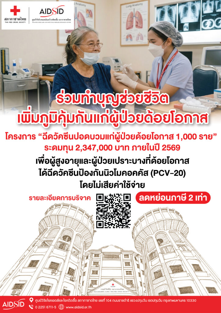 ในโครงการ “ฉีดวัคซีนปอดบวมแก่ผู้ป่วยด้อยโอกาส 1,000 ราย” ระดมทุน 2,347,000 บาท ภายในปี 2569 เพื่อผู้สูงอายุและผู้ป่วยเปราะบางที่ด้อยโอกาสได้ฉีดวัคซีนป้องกันนิวโมคอคคัส (PCV-20) โดยไม่เสียค่าใช้จ่าย
